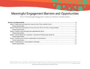 This practical resource outlines commonly expressed challenges to meaningful engagement along with recommendations for preventing, mitigating, or addressing each. Learn how to address and mitigate the barriers that lead organisations to exclude people with lived experience, and those that lead impacted people to believe they might not succeed.