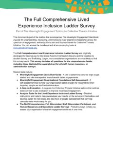 The Full Comprehensive Lived Experience Inclusion Ladder Survey was originally developed for internal use for the Global Fund to End Modern Slavery and the Coalition to Abolish Slavery and Trafficking. Larger, more established organisations are most likely to find this survey useful. This survey includes all questions for the comprehensive ladder, including those that might be separated out for all-staff, human resources, or administration surveys.