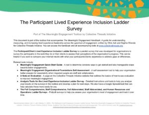 Posted By Chris July 3, 2025The Participant/Client Lived Experience Inclusion Ladder Survey is a parallel survey that was developed for organisations to survey the participants in the work they do or their clients to assess their perceptions of the organisation’s progress. This can be helpful if you want to compare your internal results with what your participants/clients experience to address gaps or differences. It is designed to be used in conjunction with one or more of our Organisational Inclusion Ladder Surveys, available in our Tools Library.