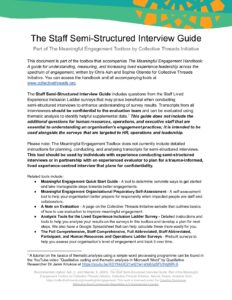 A guide with interview questions designed to supplement findings from organisational implementation of the Lived Experience Inclusion Ladder surveys.  For more on evaluation, please see our A Note on Evaluation guidance.