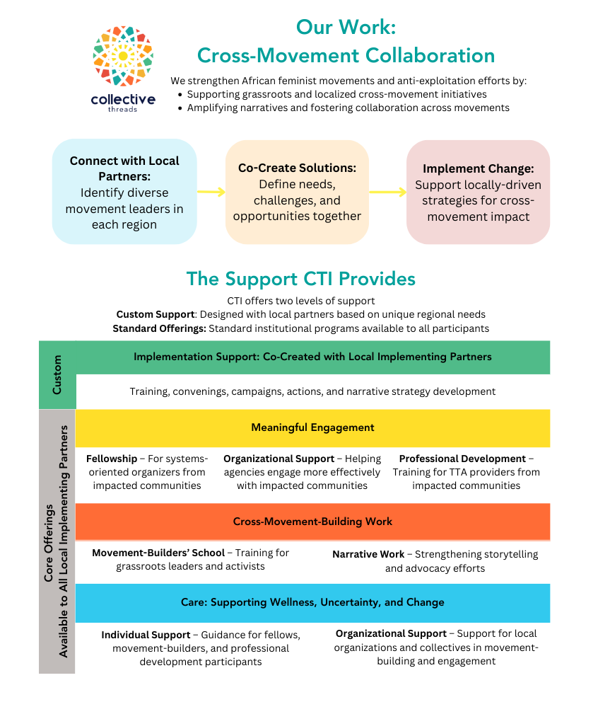 CTI envisions a world where movements collaborate rather than operate in isolation, where funding directly reaches grassroots leaders, and where solutions are driven by those most affected. By fostering equitable partnerships, shifting harmful narratives, and ensuring long-term resourcing for impactful work, CTI aims to create new paradigms for ending exploitation.