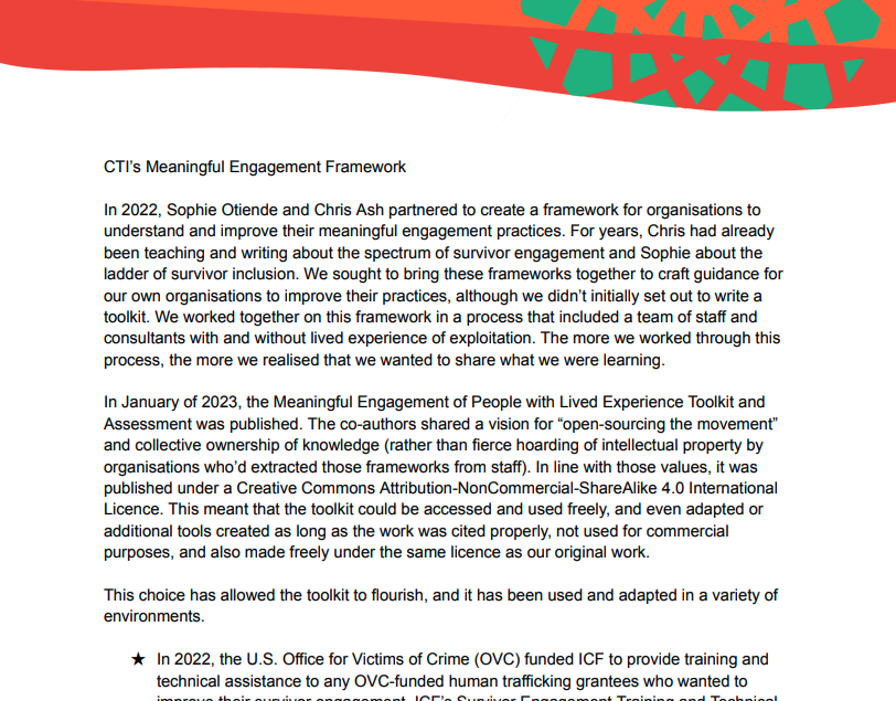 Choosing advisory board members just because of their trauma experiences is tokenising, and yet many traditional approaches to creating a job description are meant to exclude rather than clarify. This worksheet, developed by CTI Co-Founder Chris Ash in 2021, can help organisations 1) Identify the areas of their work a board could advise on, 2) Identify the elements to be advised, and 3) Determine the skills needed to perform that kind of advising, so that they can 4) Craft a specific job description for an advisory board member that highlights skills needed without unnecessary reliance on formal education and “professional” experience. |